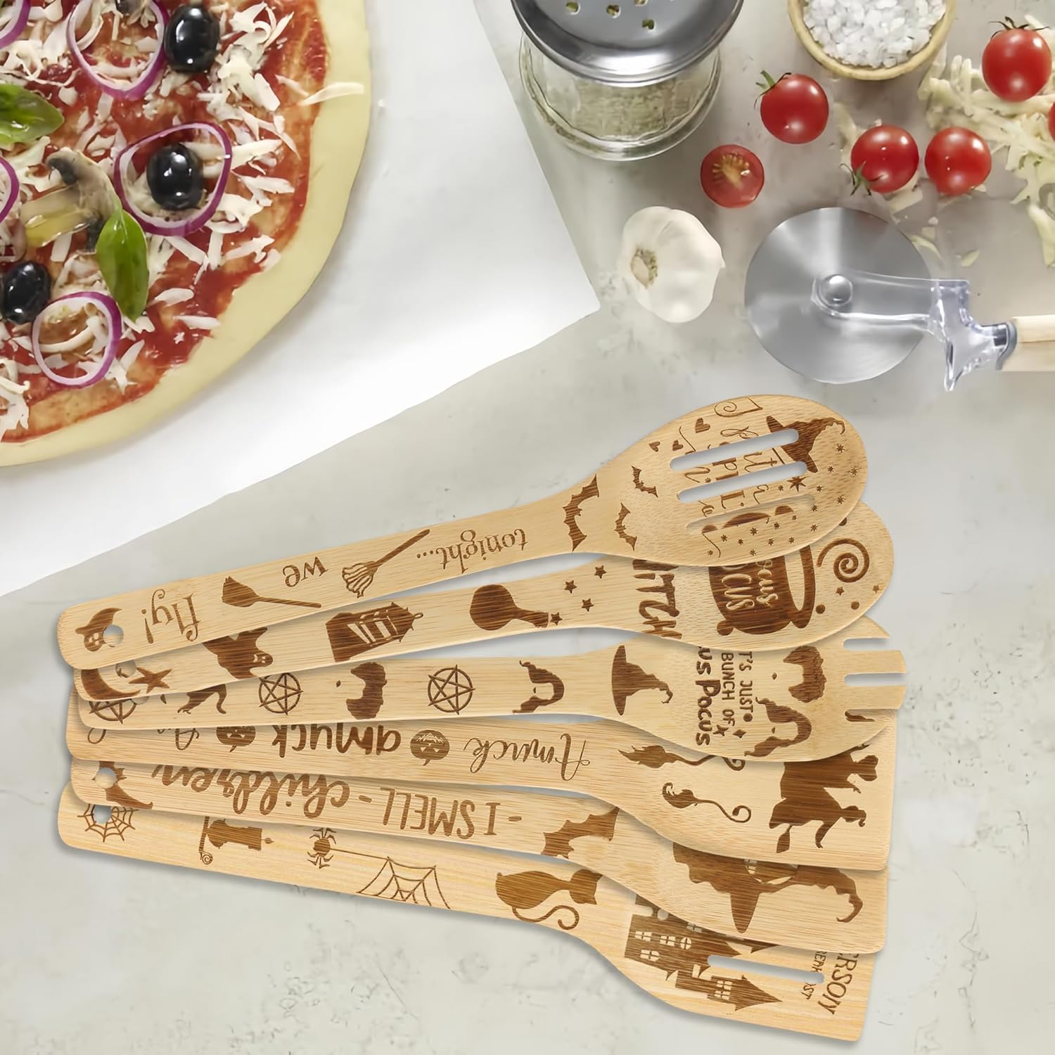 Bundle Contains: This set of spoon utensils contains 6pcs Hocus Pocus themed wood spoons, together with a sloted spoon, stable spoon, fork spoon, turner spatula, curved spatula, sloted spatula, with 6 totally different types of cookware, sufficient amount and elegance to satisfy your vacation, get together or on a regular basis wants.