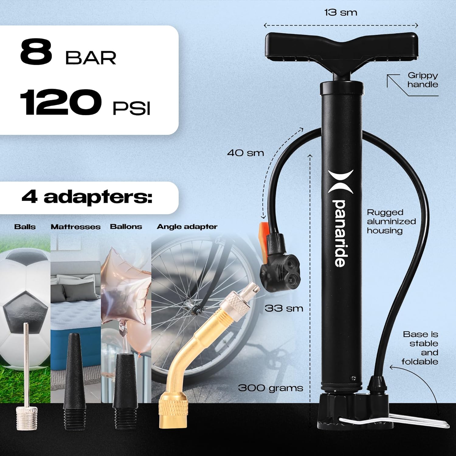 Utilizing our air pump for bike tires is not only simple and easy but in addition extremely efficient. With 120-160 psi and 8-10 bar energy, this hand air pump for tires can inflate a variety of equipment in document time. The T-bar design makes it tremendous simple to make use of, whereas the foot pedestal ensures glorious stability. The set comes with the precise tire pump for bike with a multifunctional valve, in addition to an angle adapter and extra adapters for varied inflating jobs.