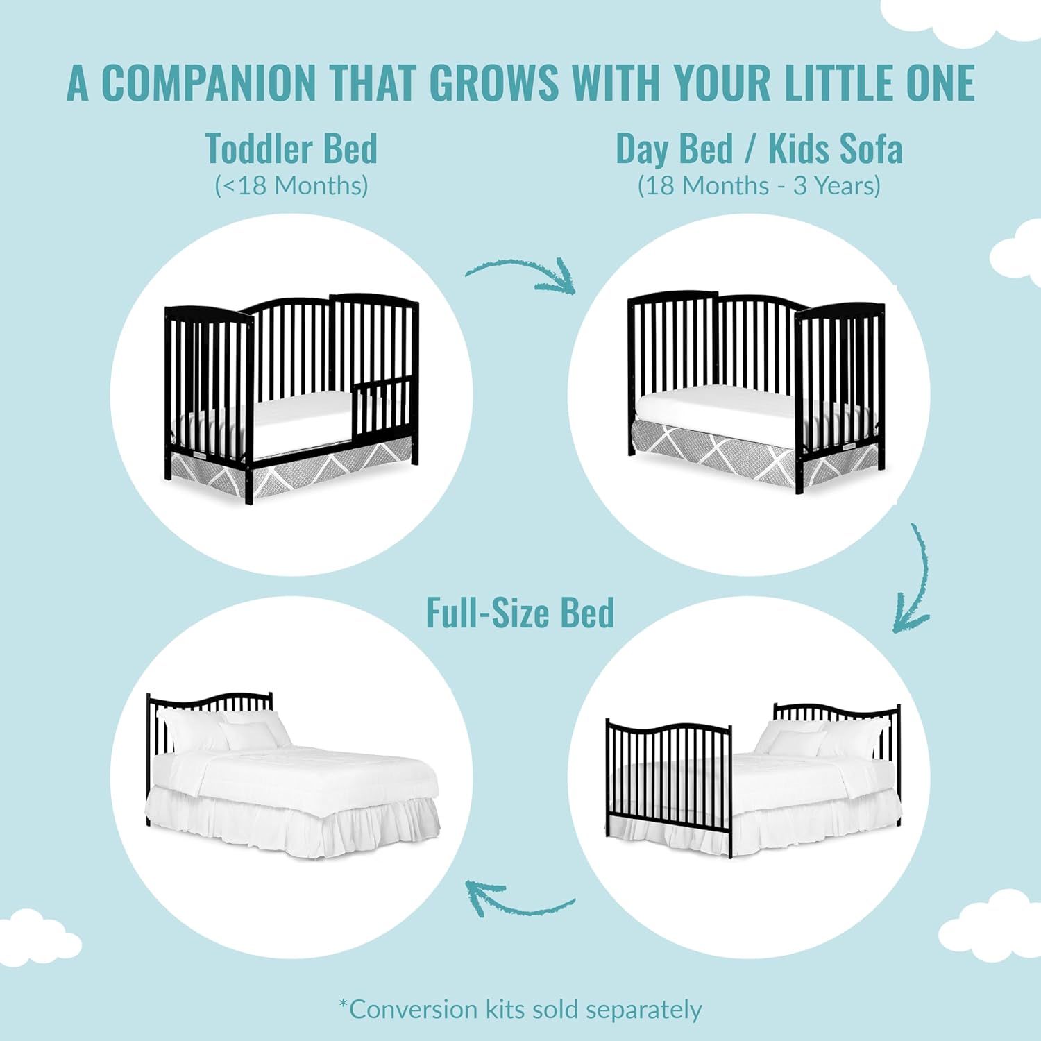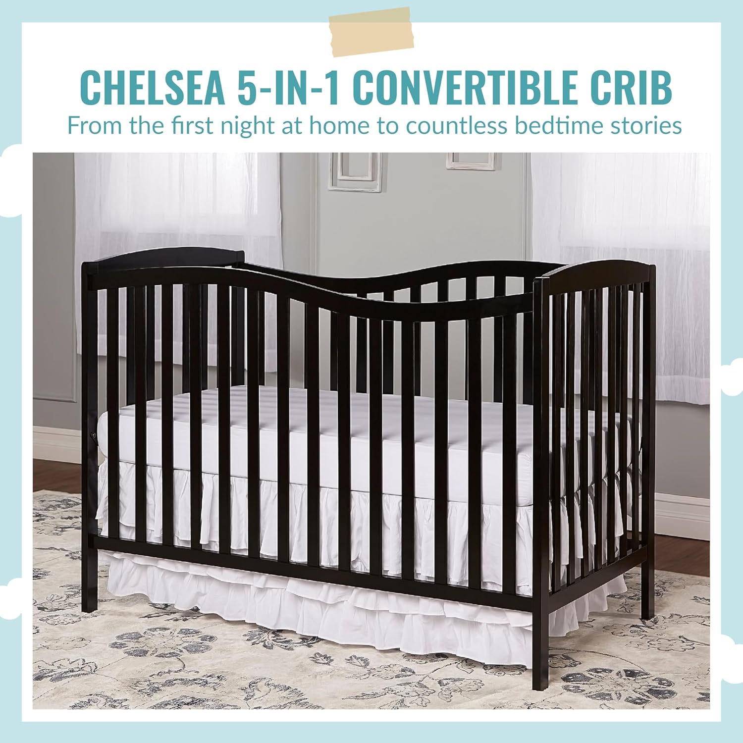 The pleasant Chelsea 5-in 1 Convertible Crib is a timeless crib that grows together with your baby, a relentless companion from childhood to younger maturity. Versatile conversion choices enable it to fulfill your baby’s altering wants. It transitions from a crib to toddler mattress, daybed, and full measurement mattress with easy ease (toddler guardrail, stabilizer, full measurement rail and mattress body bought individually). It gives the comfort of 4 mattress top positions, which may be adjusted in keeping with the age of your child. Constructed of sturdy, sustainable and renewable New Zealand pinewood, its flowing sleigh design is at dwelling in any child or rising baby’s room. A mixture of curved and straight strains, it’s out there in non-toxic basic finishes and sits low to the ground permitting ease of entry to your baby. All our cribs are designed with a give attention to security, are JPMA licensed and meet all relevant ASTM/CPSC requirements. All instruments for meeting included. It measures 53L X 29W X 38H inches; most weight capability is 50 lbs. For the perfect match, we advocate any Dream on Me/Evolur commonplace, full-size, non-toxic, Greenguard Gold licensed crib mattress (bought individually).