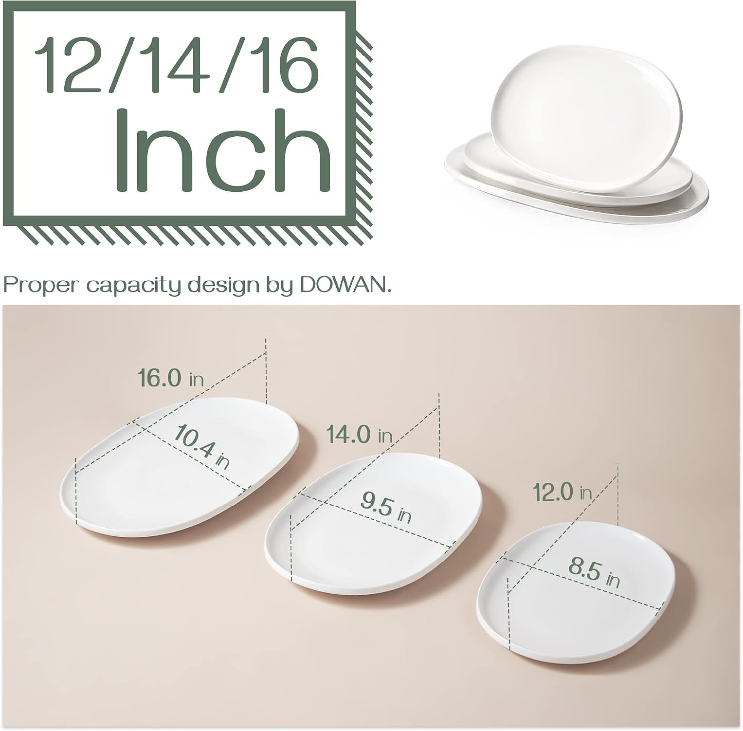 Massive Serving Platters Set of three Massive: 16 x 10.4 inch Medium: 14 x 9.5 inch Small: 12 x 8.5 inch Coloration: White Amount: 3 packs Materials: Excessive-fired Porcelain & Easy Glaze Stand up to the very best temperature: 500℉