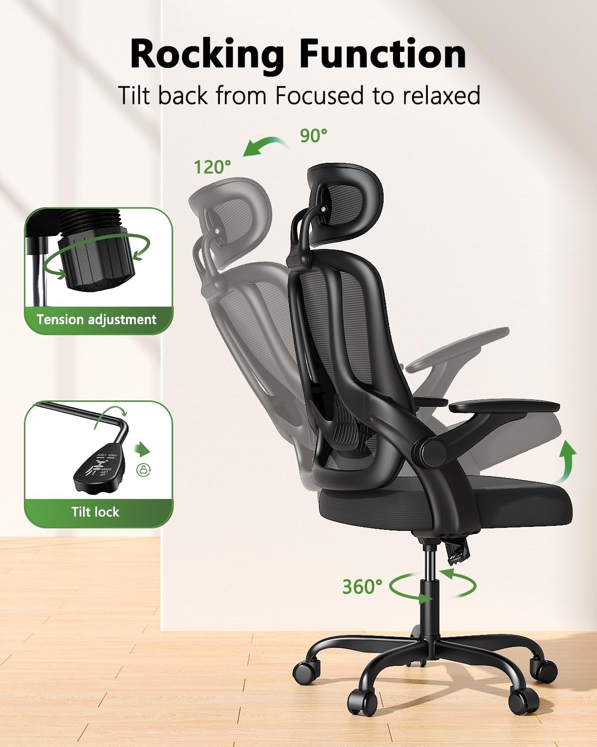 Versatile Design, Area-Saving: This Excessive Again workplace chair’s adjustable flip-up armrests may be flipped as much as match completely different wants and small locations, saving house, versatile while you play guitar or gaming. Moreover, it may also be moved forwards and backwards and pivoted left and proper, providing help to your arms and elbows as you’re employed. Together with a rocking mechanism that facilitates back-and-forth movement, this ergonomic workplace chair encourages you to loosen up and luxuriate in some leisure time.