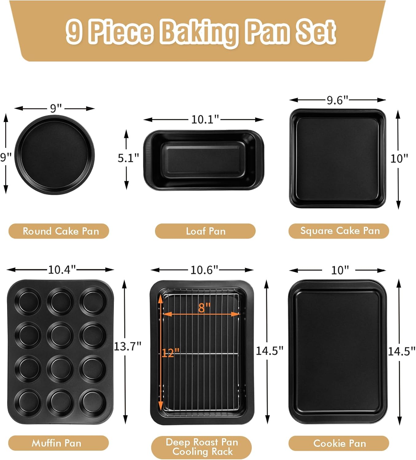 9 PIECE BAKING PANS SET: EKRHORBY 9pcs baking sheet set consists of all the pieces you want on your kitchen – deep baking tray (14.5″x10.6″x1.96″), cookie sheet (14.5″x10″x0.62″), cake pan (9″x9″x1.1″), 12-cup muffin pan (13.7″x10.4″x1.18″), sq. bread pan (10″x9.64″x1.81″), Loaf Pan (10.0″x5.1″x2.28″), cooling rack(12″x8″), 12pcs silicone cupcake liners and oven mitt.