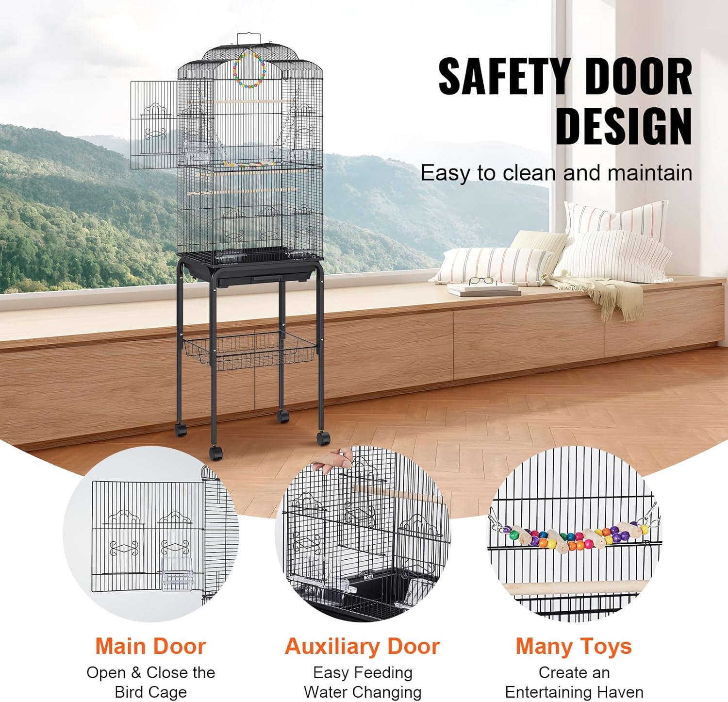 Easy Mobility: That includes 4 secure swivel wheels, our giant chicken cage is simple to maneuver round with out lifting or dragging but additionally facilitate inserting the cage within the desired location. Cut back the danger of sliding or tilting resulting from unintended contact or the motion of pet birds.